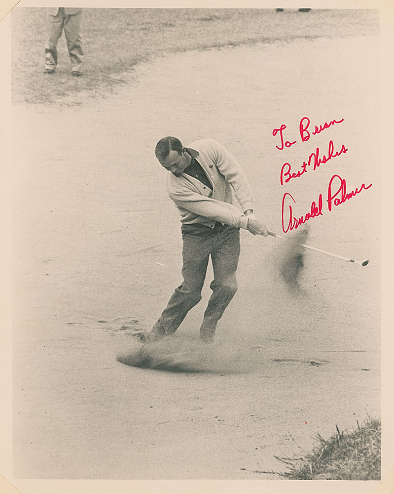 Vintage glossy 8 x 10 photo of Palmer hitting out of a sand trap, signed and inscribed in red felt tip, “To Brian, Best wishes, Arnold Palmer.” In fine condition, with a crease to top left corner tip. Pre-certified Steve Grad/PSA/DNA and RR Auction COA.