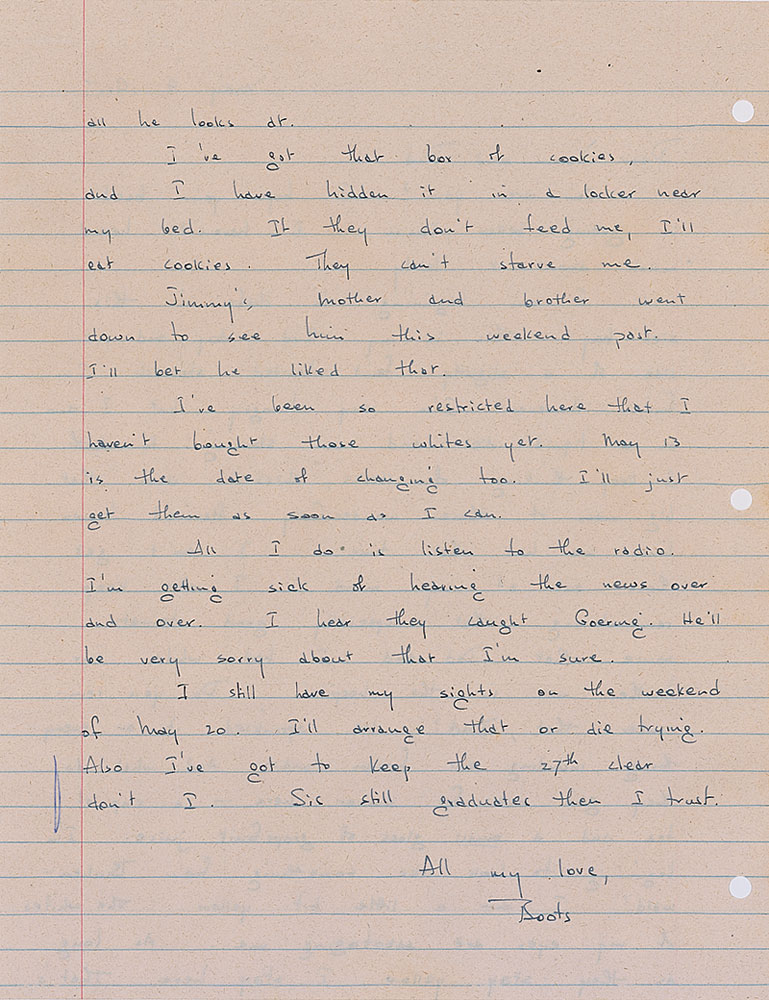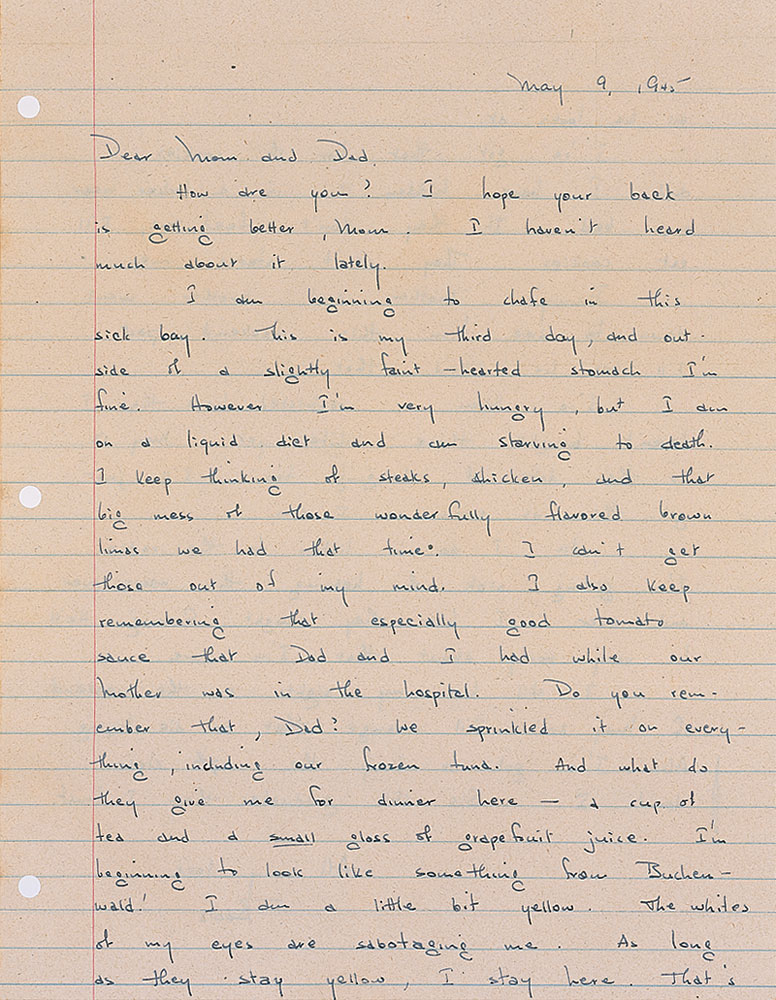 ALS signed “Boots,” one page, lightly-lined, 8.5 x 11, May 9, 1945. Letter to his parents. In part: “I am beginning to chafe in this sick bay…I’m very hungry, but I am on a liquid diet and am starving to death. I keep thinking of steaks, chicken, and that big mess of those wonderfully flavored brown limas…for dinner here—a cup of tea and a small glass of grapefruit juice. I’m beginning to look like something from Buchenwald!…I’ve got that box of cookies and I have hidden it in a locker near my bed. If they don’t feed me, I’ll eat cookies. They can’t starve me…All I do is listen to the radio. I’m getting sick of hearing the news over and over. I hear they caught Goering. He’ll be very sorry about that I’m sure.” In fine condition, with light toning. Accompanied by the original mailing envelope, addressed in Kuhn’s hand, writing his name, “B. K. Kuhn,” in the return address area. At this time, Kuhn was attending Franklin and Marshall College in the V-12 Navy College Training Program. Pre-certified Steve Grad/PSA/DNA and RR Auction COA.