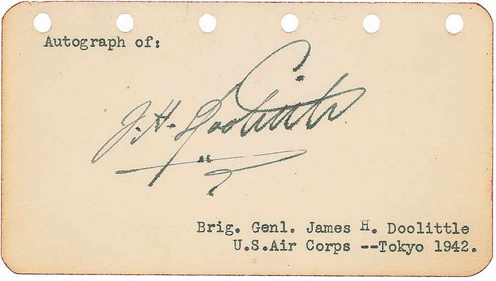 Vintage ink signature, “J. H. Doolittle,” on an off-white 4.5 x 2.5 page, with typed collector’s notations and binder holes across the top edge. In fine condition, with a bit of scattered light toning. RR Auction COA.