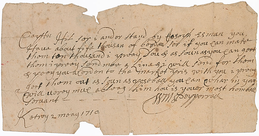 Sea merchant (1646–1734) who developed a simple fishing business into a worldwide commercial empire. ALS signed “Wm. Pepperell,” one page, 7.5 x 3.75, May 2, 1710. Letter regarding a business transaction. In part (spelling and grammar retained): “You have about fife thousan…if you can make them ten thousand…as soun as you can get them…I will send for them & pray you afford on to the market pris with you I pray get them out as soun as posoboll.” In very good condition, with heavy overall creases, a couple areas of paper loss to edges, and scattered foxing. RR Auction COA.