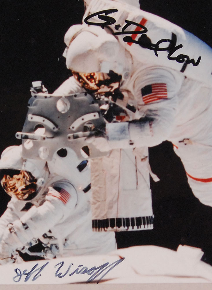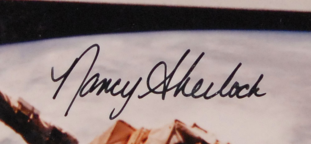 Flown embroidered Shuttle STS-57 mission patch, 4″ in diameter, carried on board the Endeavour during its June-July 1993 mission. Patch is affixed to a 16 x 20 color glossy composite photo of the shuttle and crew, with a typed caption affixed under the patch, and signed in black felt tip by Ron Grabe, Brian Duffy, G. David Low, Nancy Sherlock, Peter Wisoff, and Janice Voss, with a brief sentiment written at the top in an unknown hand. In fine condition, with some scattered light surface marks and dings. Pre-certified Steve Zarelli and RR Auction COA.