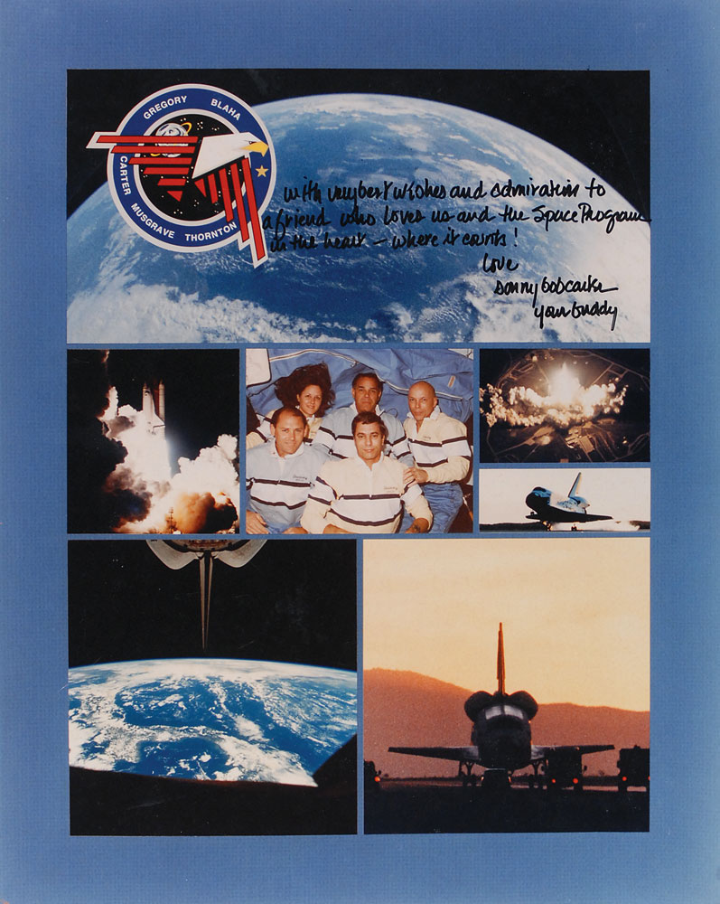 NASA astronaut (1947-1991) who flew on STS-33. He was scheduled to fly on STS-42, but perished in a plane crash. Color glossy 16 x 20 composite photo of the STS-33 mission, signed and inscribed in black felt tip, “With very best wishes and admiration to a friend who loves us and the Space Program in the heart—where it counts! Love Sonny Bob Carter, your buddy.” Photo is partially affixed to an identical size mount. In fine condition. Pre-certified Steve Zarelli and RR Auction COA.