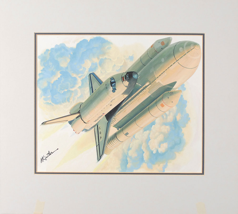 Artist and illustrator. During his career, he accepted a major commission to do a series of paintings of the building, launch, and touchdown of the first space shuttle Columbia. In 1979, Künstler became the official Space Shuttle artist for NASA and Rockwell International. Original gauche painting of the liftoff of the Space Shuttle Columbia, on a 20 x 18 off-white artist’s board, signed in the lower left, “M. Kunstler.” Double-matted to an overall size of 20 x 18. In very fine condition. RR Auction COA.