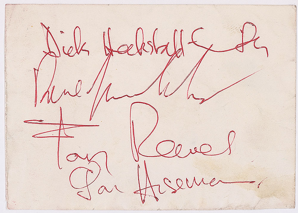 Vintage ballpoint signatures of Dick Heckstall-Smith, Dave Greenslade, Tony Reeves, and Jon Hiseman on an off-white 4 x 3 slip. Some scattered soiling, otherwise fine condition. Pre-certified Roger Epperson/REAL and RR Auction COA.