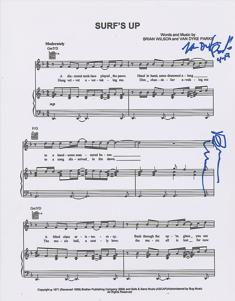 Sheet music to ‘Surf’s Up,’ six off-white pages, 8.5 x 11, signed on the first page in blue felt tip by Brian Wilson and Van Dyke Parks. In fine condition. Pre-certified Roger Epperson/REAL and RR Auction COA.