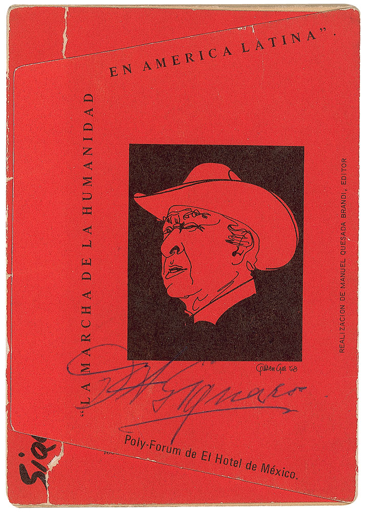 Realist painter (1869-1974), known for his large murals in fresco that established the Mexican Mural Renaissance. Postcard portfolio entitled “La Marcha de la Humanidad en America Latina,” 4 x 6, containing nine postcards with images of Siqueiros’s works, signed on the front cover of the portfolio by Siqueiros. In fine condition, with some light wear and creases to covers. RR Auction COA.
