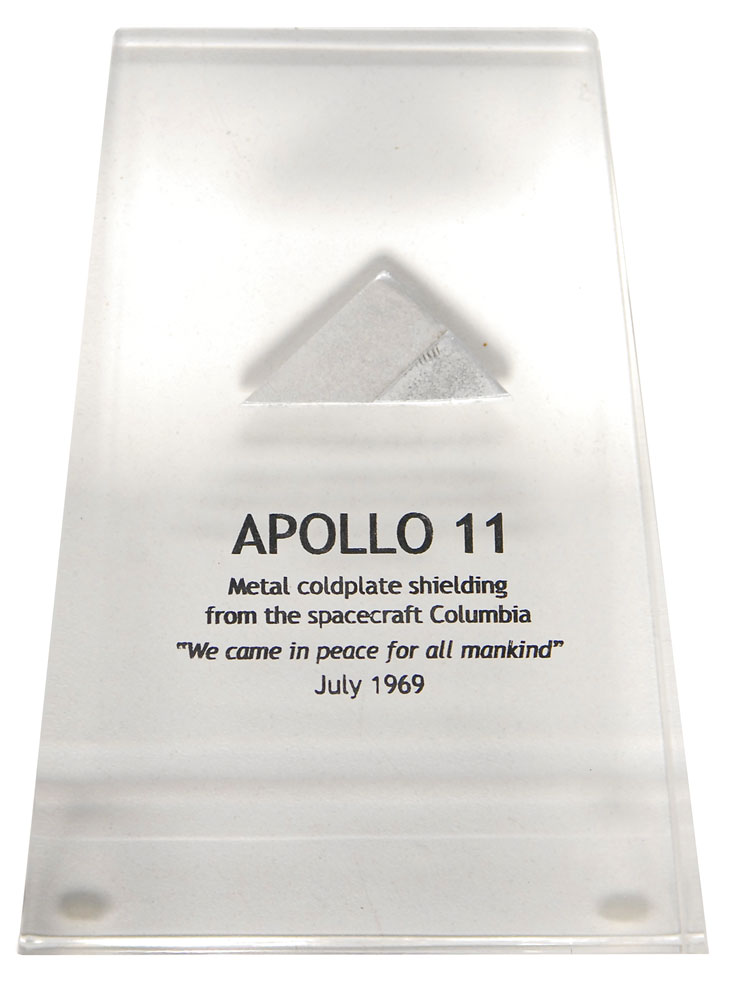 Flown piece of coldplate metal used to shield the Apollo 11 Command Module Columbia as it carried the crew to and from the moon. The triangular-shaped fragment measures approximately 1.25 x .75 and is encased in a 3.5 x 5 x 1.5 block of Lucite imprinted with the mission name and an identifying notation. In fine condition. Presentation comes in its original box with a certificate from Historic Space. RR Auction COA.