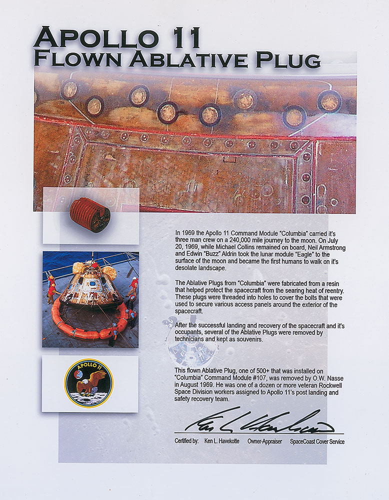 Flown ablative plug, removed from the Columbia command module after splashdown by O. W. Nasse, who was assigned to the Apollo 11 post landing and safety recovery team. Plug measures .75″ long and is accompanied by a printed letter of authenticity from Ken Havekotte. RR Auction COA.
