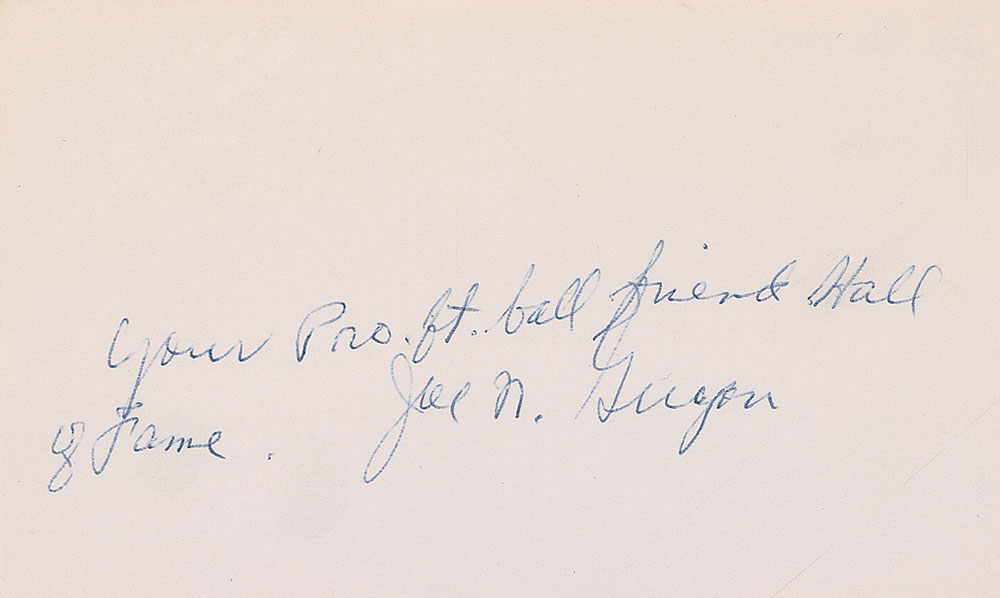 Football Hall of Famer (1892–1971) who played with Jim Thorpe. Ballpoint signature, “Your Pro. Ft. ball friend Hall of Fame Joe N. Guyon,” on an off-white 5 x 3 card. In fine condition. Pre-certified Steve Grad/PSA/DNA and RR Auction COA.