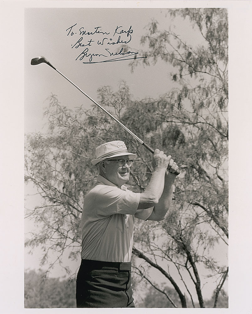 Glossy 8 x 10 photo of Nelson after a drive, signed and inscribed in black felt tip, “To Martin Karp, Best wishes, Byron Nelson.” In fine condition. Pre-certified Steve Grad/PSA/DNA and RR Auction COA.