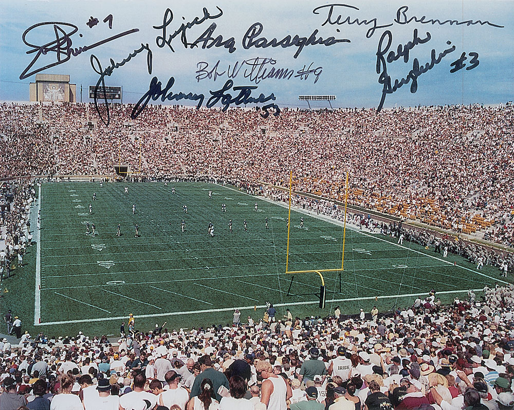 Color glossy 10 x 8 photo of a jam-packed Notre Dame Stadium, signed in black felt tip by seven former players and coaches. Signers are: Joe Theismann, Johnny Lujack, Ara Parseghian, Bob Williams, Terry Brennan, Johnny Laettner, and Ralph Guglielmi. In fine condition. Pre-certified Steve Grad/PSA/DNA and RR Auction COA.