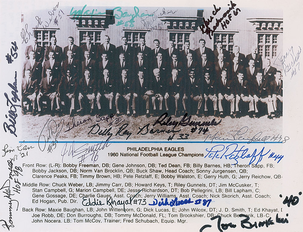 Cardstock 11 x 8.5 photo of the 1960 Philadelphia Eagles, signed in various color felt tip and ink by 18 members: Billy Ray Barnes, Ted Dean, Pete Retzlaff, J. D. Smith, Chuck Bednarik, Chuck Weber, Jerry Reichow, Maxie Baughan, Marion Campbell, Theron Sapp, Jim McCusker, Bill Lapham, Eddie Khayat, Tom Brookshier, Jim Carr, Riley Gunnels, Dick Lucas, and Tommy McDonald. In fine condition, with some light edge and corner creases. Pre-certified Steve Grad/PSA/DNA and RR Auction COA.