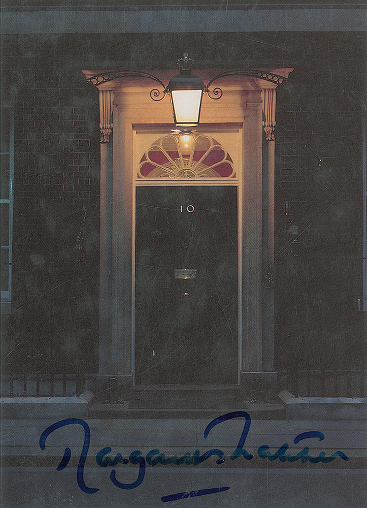 Two photos: satin-finish 5 x 7 portrait of Thatcher, signed in the lower border in black felt tip; and a color 5 x 7 light-weight photo of 10 Downing Street, signed at the bottom in blue felt tip. Scattered surface marks and dings to the color photo, otherwise overall fine condition. RR Auction COA.