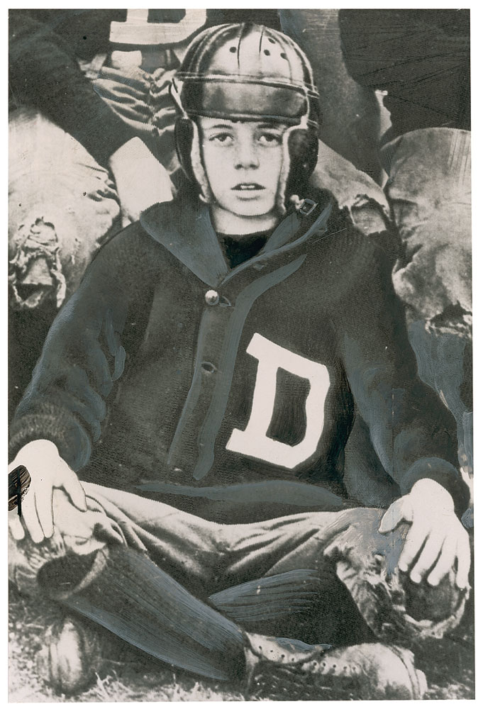 Original glossy 5.5 x 8.5 wire service photo of a 10 year-old John Kennedy in his Dexter football uniform and helmet. Printed in 1960, this image of Kennedy is from 1927 and his playing days for his alma matter. In fine condition, with heavy production highlights to darker areas and a few ripples. The original newspaper photo of the image is affixed to the reverse. A very early example of Kennedy’s lifelong affinity with sports. RR Auction COA.