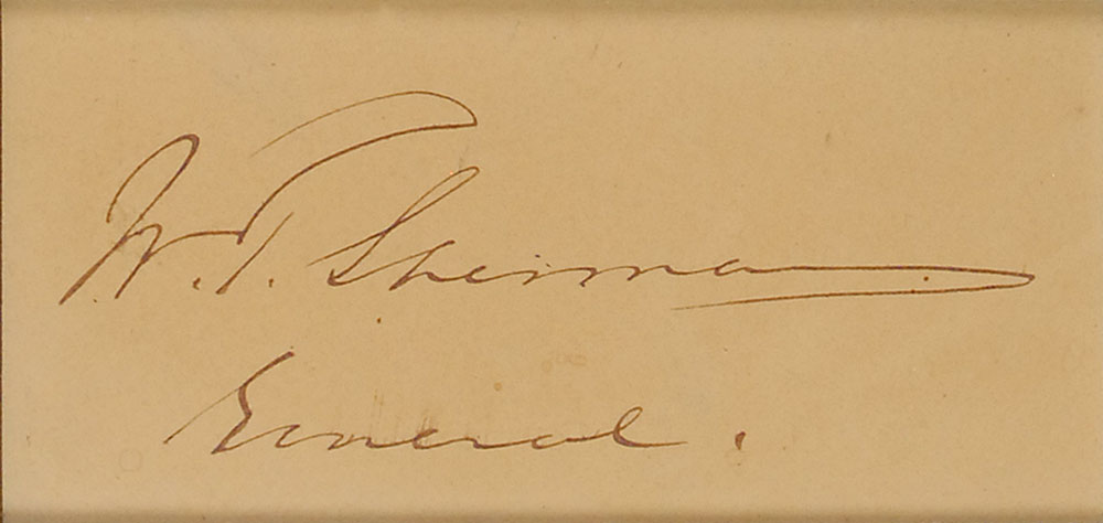 Ink signature, “W. T. Sherman, General,” on an off-white card. Double-matted and framed with a portrait of Sherman in uniform to an overall size of 10.75 x 16.5. In fine condition, with uniform toning to card. Accompanied by a full letter of authenticity from PSA/DNA. RR Auction COA.