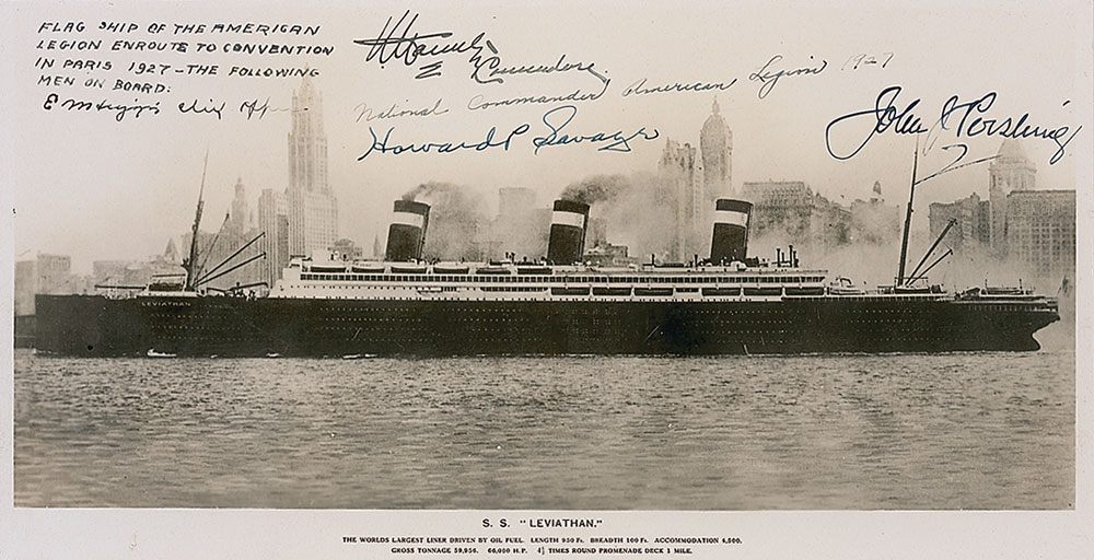 Vintage glossy 10.5 x 5.5 oversized postcard photo of the SS Leviathan, signed on the right side in fountain pen, “John J. Pershing.” Also signed by Herbert Hartley, Howard P. Savage, and one other. Notation to left side reads, “Flag ship of the American Legion en route to convention in Paris 1927—the following men on board,” and another identifies Savage as, “National Commander American Legion 1927.” In fine condition. Accompanied by an unsigned photo of Pershing and Hartley on the deck of the ship. Pre-certified PSA/DNA and RR Auction COA.