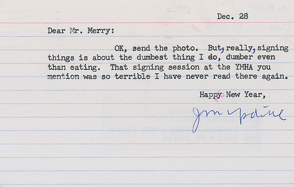 Satin-finish 10 x 8 photo of Updike in a boat, signed and inscribed in black felt tip, “For Harold Merry, John Updike”; and a TNS to Merry on a 5.5 x 3.5 lined card, December 28, 1990, in full: “OK, send the photo. But, really, signing things is about the dumbest thing I do, dumber even than eating. That signing session at the YMHA you mention was so terrible I have never read there again.” In overall fine condition. RR Auction COA.