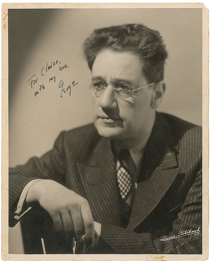 Pulitzer Prize–winning American critic, humorist, and playwright (1889–1961) best known for You Can’t Take It with You and The Man Who Came to Dinner. Vintage glossy 8 x 10 portrait of Kaufman by preeminent Broadway photography studio Lucas-Pritchard, signed and inscribed in fountain pen to Claire Luce, “For Claire, with my love, George.” In very good condition, with moderate to heavy overall creases and paper loss to upper left corner tip. Accompanied by an ALS to Luce by playwright Howard M. Teichmann, one page, 8.25 x 9.5, personal letterhead, March 3, 1972, in part: “I am returning your photo of George S. Kaufman. It has been reproduced and right now the editors are deciding which picture will be used.” RR Auction COA.