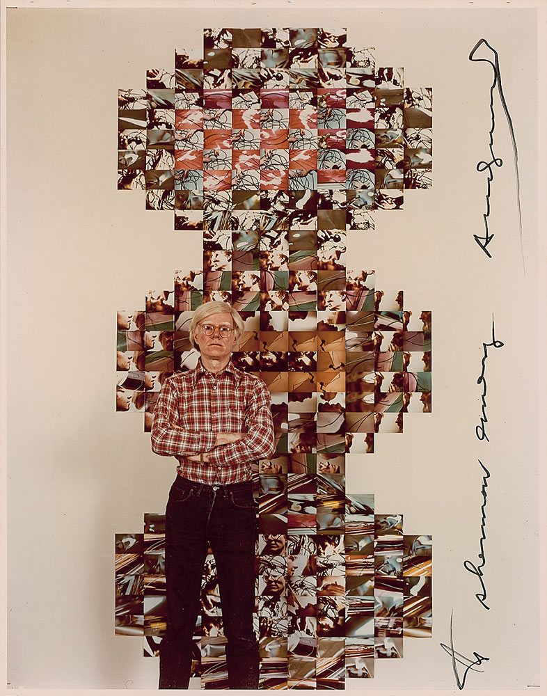 Exceptional color satin-finish 11 x 14 photo of Warhol standing in front of one of his tall photo collages, vertically signed and inscribed in black felt tip, “To Sherman Emery, Andy Warhol.” In fine condition, with a miniscule tear to the top edge. This is just the second photo of this size that we have offered, with this one especially desirable as it depicts him with one of his works—a superb image of one of the most influential artists of the latter half of the 20th century. Pre-certified PSA/DNA and RR Auction COA.
