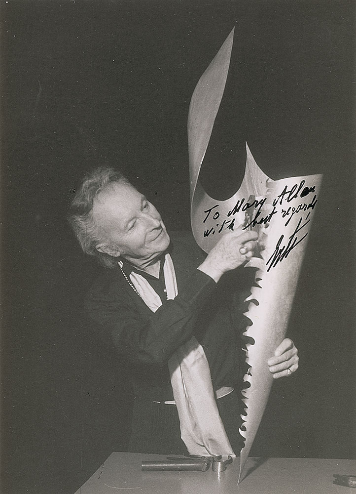 Glossy 5 x 7 photo of Erte with an interesting sculpture, signed and inscribed in black ink, “To Mary Allen, with best regards, Erte.” A few surface creases, otherwise fine condition. RR Auction COA.