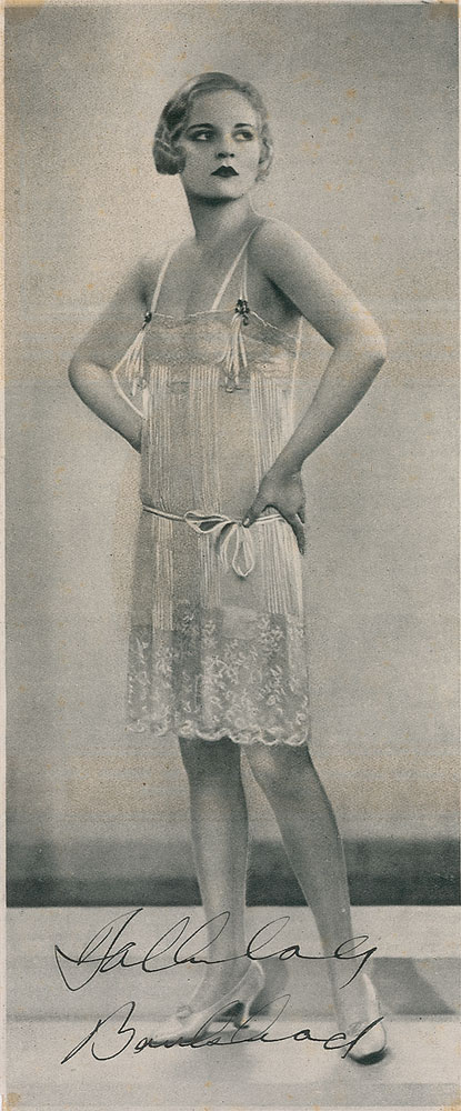Vintage 3.75 x 9 magazine photo of a young Bankhead in a short skirt, signed in fountain pen. Photo is affixed to a 7.5 x 9.75 white board. In fine condition. Pre-certified PSA/DNA and RR Auction COA.