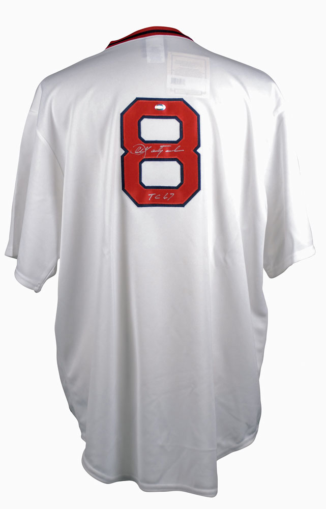 Official Majestic Cooperstown Collection replica Boston Red Sox baseball jersey, with sewn on letters and numbers, signed in silver ink on the number on the back, “Carl Yastrzemski, TC 67.” In fine condition. Pre-certified Steve Grad/PSA/DNA and RR Auction COA.