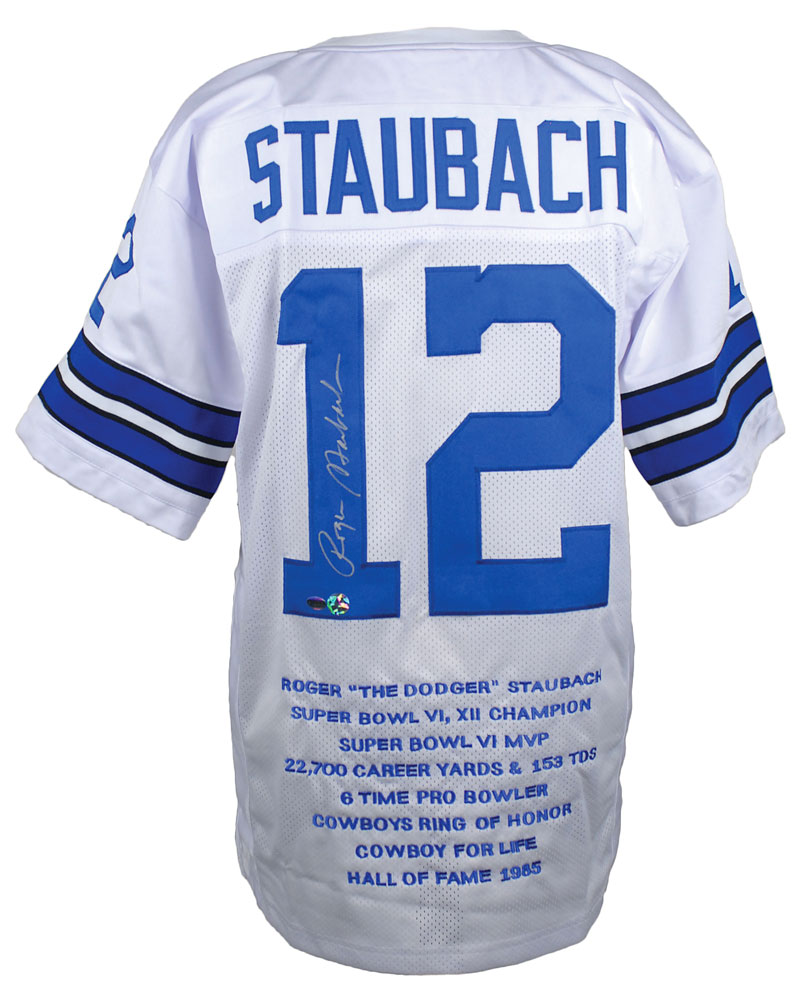 Replica Dallas Cowboys football jersey, with sewn on letters and numbers, as well as an embroidered list of Staubach’s achievements, signed in silver ink on the number on the back. In fine condition. Pre-certified Steve Grad/PSA/DNA and RR Auction COA.