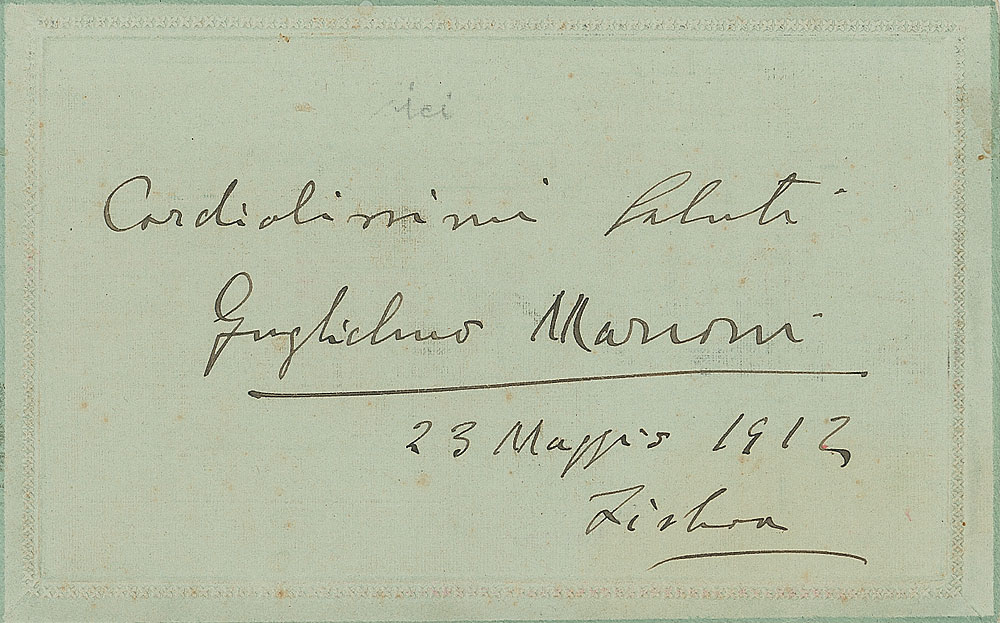 Vintage ink signature, “Cordialmente saluti, Guglielmo Marconi, 23 Maggio 1912, Lisbon,” on a light green 5.5 x 3.5 card. In fine condition, with scattered soiling. On this day, Marconi gave a conference at the Lisbon Geographical Society to promote his system in order to win a contract for the supply and assembly of radiotelegraphy stations in Portugal. RR Auction COA.