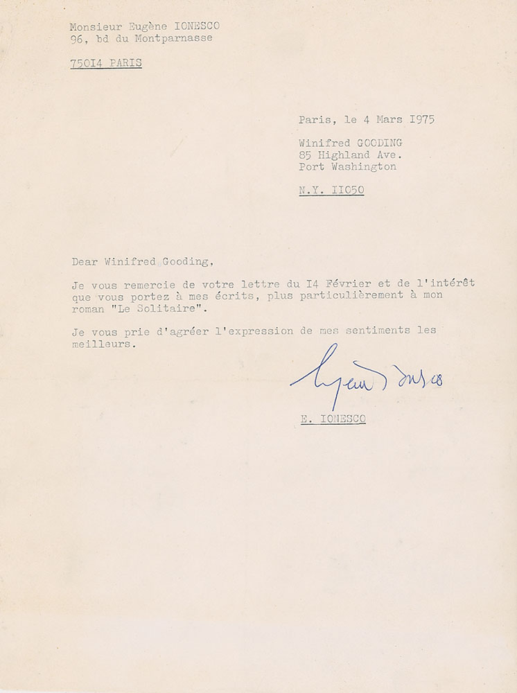 TLS in French, one page, 8 x 10.5, March 4, 1975. Untranslated letter to Winifred Gooding. Central vertical and horizontal folds (horizontal fold passing through bottom of signature), and scattered wrinkles, otherwise fine condition. Accompanied by the original mailing envelope. RR Auction COA.