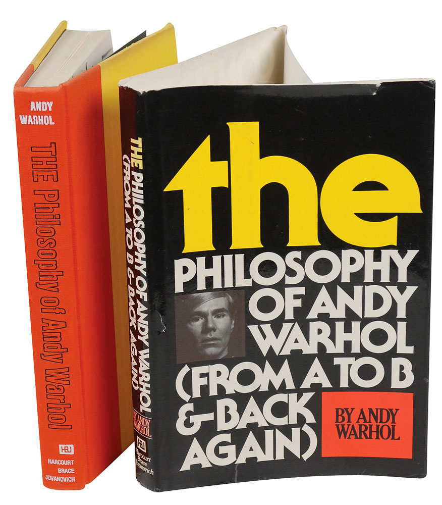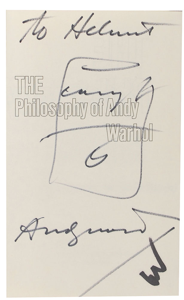Signed book: The Philosophy of Andy Warhol. First edition, first printing (marked “BCDE” below the stated edition). NY: Harcourt Brace Jovanovich, 1975. Hardcover with dust jacket, 5.75 x 8.5, 241 pages. Signed and inscribed on the half-title page, “To Helmut, Andy Warhol,” with the addition of a large sketch of his famous Campbell’s tomato soup can, labeled “Campbell.” Autographic condition: fine. Book condition: VG+/VG. Orange cloth-covered spine and yellow paper-covered boards; slight soiling/discoloration and mild wear to edges, heavier along upper edges; minor soiling to textblock edges. Dust jacket has small tears and creasing along edges (mostly at corners and spine-ends); one small tear to front cover near spine; colored ink on spine very slightly sunned; upper corners clipped. Pre-certified PSA/DNA and RR Auction COA.