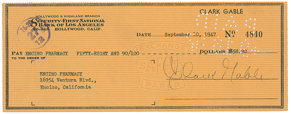 Personal check, 8.25 x 3, filled out in type and signed by Gable, payable to Encino Pharmacy for $58.90, September 10, 1947. In fine condition, with cancellation holes to top portion, not affecting the clean signature area. Pre-certified PSA/DNA and RR Auction COA.