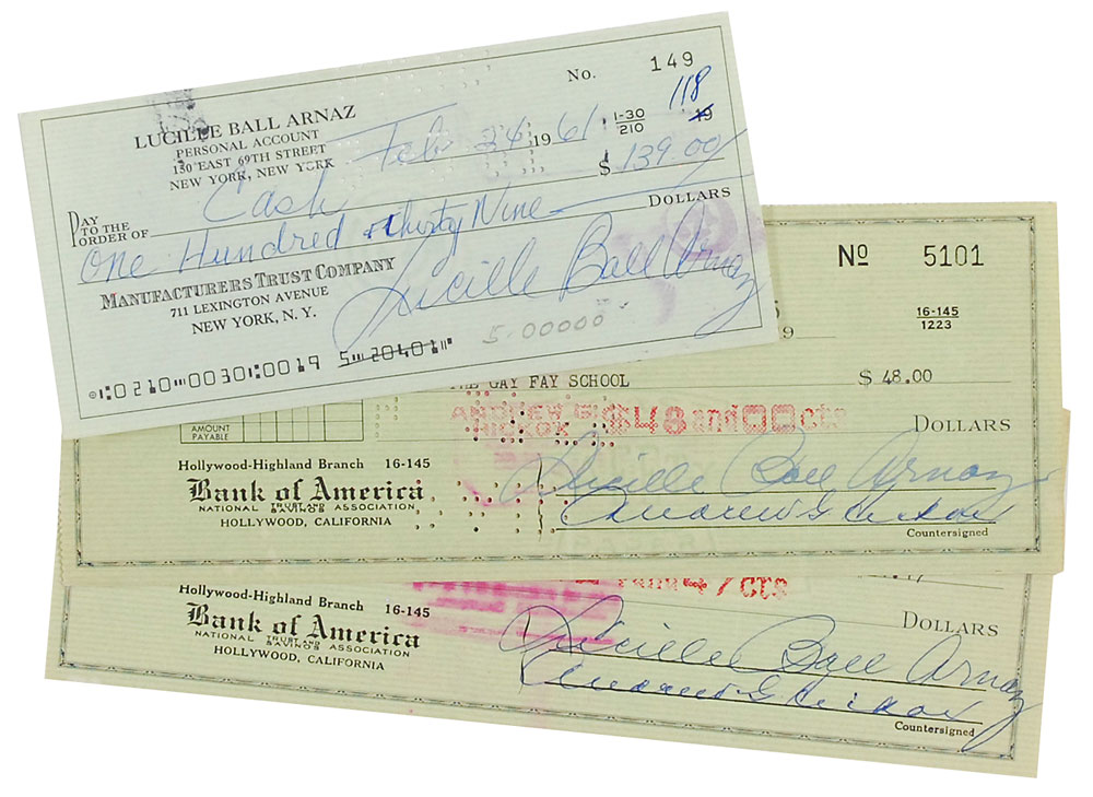 Three checks: personal check, 8.25 x 3, filled out in type and signed by Ball, “Lucille Ball Arnaz,” payable to The Gay Fay School for $48, stamp-dated April 11, 1955; personal check, 8.25 x 3, filled out in type and signed by Ball, “Lucille Ball Arnaz,” payable to Southern California Edison Co. for $24.47, stamp-dated September 6, 1955; and a personal check, 6 x 2.75, filled out and signed by Ball, “Lucille Ball Arnaz,” payable to cash for $139. In overall fine condition, with vertical folds to the larger checks, and expected bank stamps and cancellation holes (some slightly affecting signatures). RR Auction COA.
