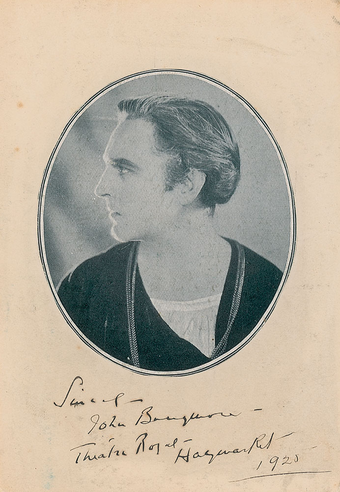 Vintage ink signature, “Sincerely—John Barrymore—Theatre Royal—Haymarket 1925,” on an off-white 3.25 x 4.75 album page with a circular photo of Barrymore affixed above his signature. Page is affixed to an identical size piece of cardstock. In fine condition, with a bit of trivial light soiling. Pre-certified PSA/DNA and RR Auction COA.