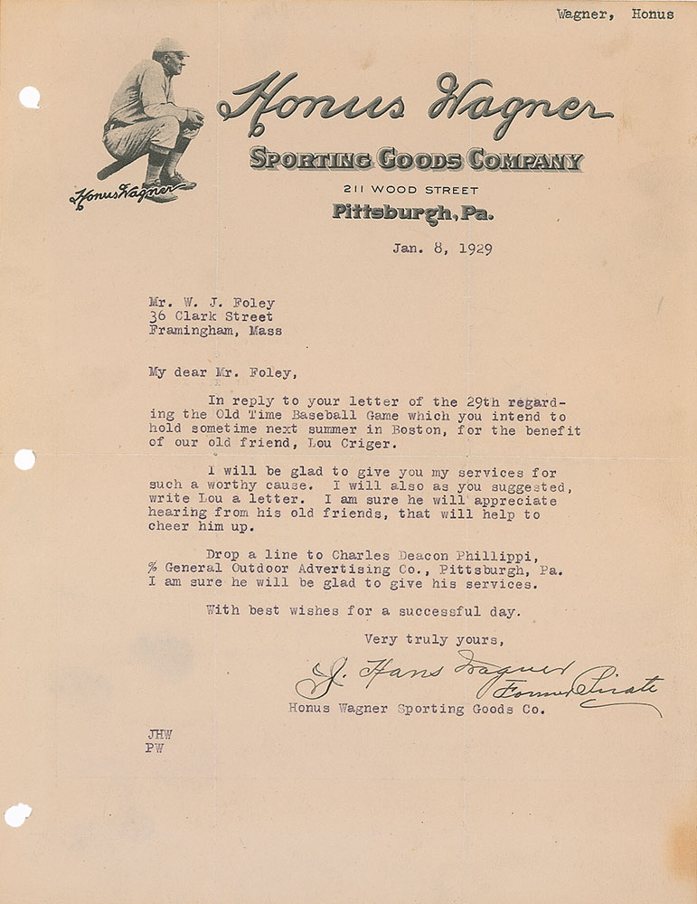 TLS signed “J. Hans Wagner, Former Pirate,” one page, 8.5 x 11, Honus Wagner Sporting Goods Company letterhead, January 8, 1929. Wagner writes to an organizer of a benefit Old Timer’s Game. In full: “In reply to your letter of the 29th regarding the Old Time Baseball Game which you intend to hold sometime next summer in Boston, for the benefit of our old friend, Lou Criger. I will be glad to give you my services for such a worthy cause. I will also as you suggested, write Lou a letter. I am sure he will appreciate hearing from his old friends, that will help cheer him up. Drop a line to Charles Deacon Phillippi, c/o General Outdoors Advertising Co., Pittsburgh, Pa. I am sure he will be glad to give his services.” In fine condition, with intersecting folds, one through a single letter of signature, a bit of trivial toning, typed name notation to upper right corner, and punch holes along left edge.