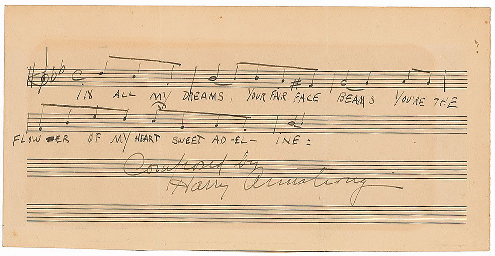 American singer, pianist, Tin Pan Alley composer, and booking agent (1879–1951). AMQS on an off-white 9.5 x 4.5 sheet of music manuscript paper. Armstrong pens five bars of music and lyrics to ‘Sweet Adeline,’ signed at the bottom, “Composed by Harry Armstrong.” In very good to fine condition, with two vertical folds passing through single letters of signature and a uniform shade of toning. RR Auction COA.