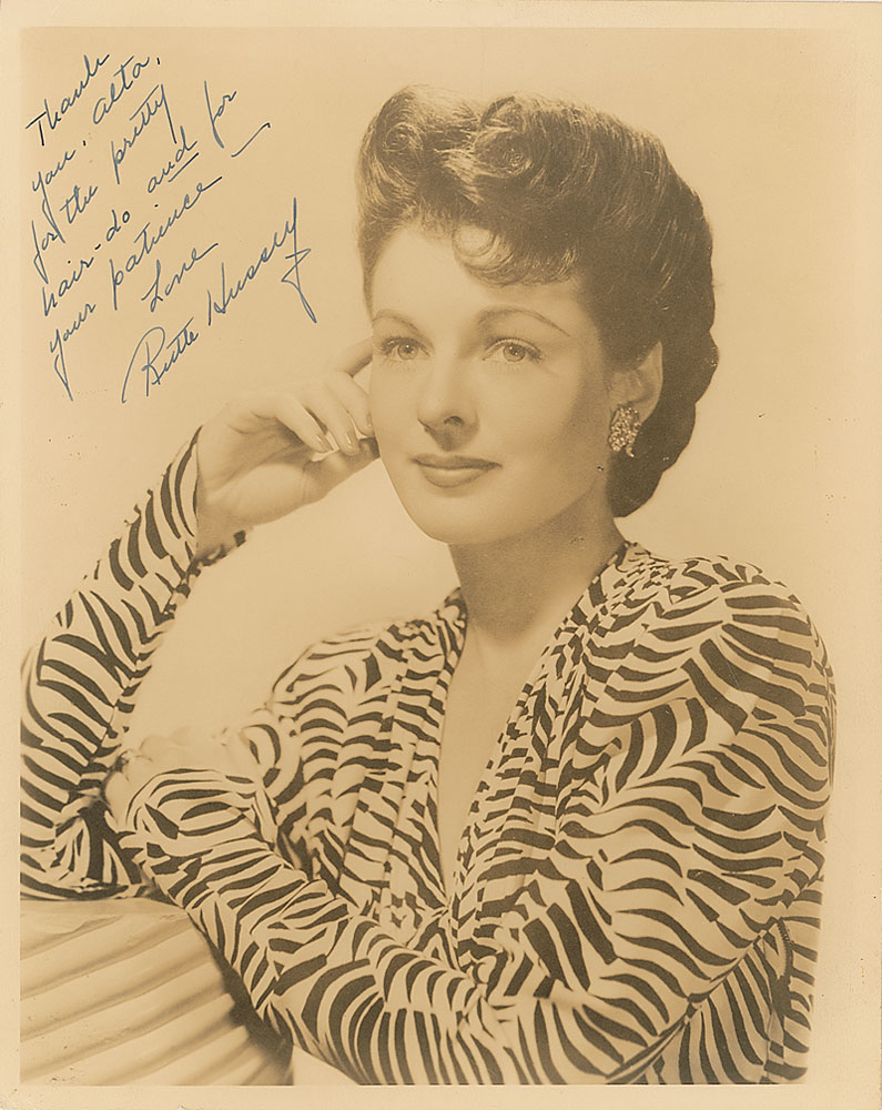 Vintage matte-finish 8 x 10 photo of the actress in a striped top, signed and inscribed in fountain pen, “Thank you, Alta, for the pretty hair-do and for your patience—Love, Ruth Hussey.” In fine condition. Pre-certified PSA/DNA and RR Auction COA.