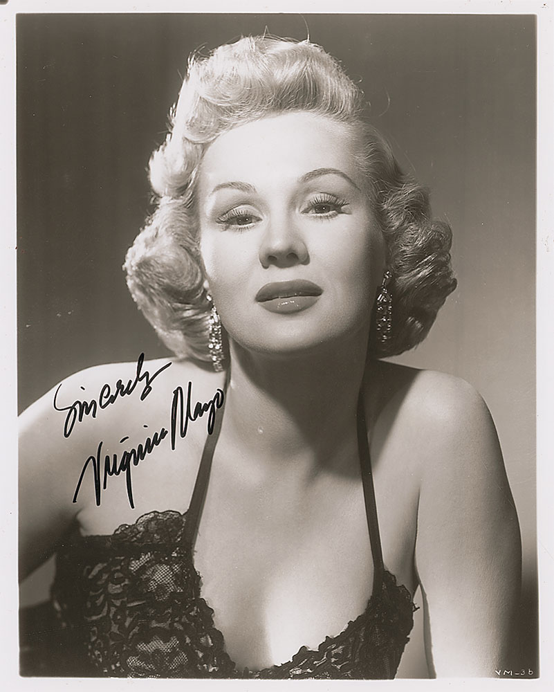 Glossy 7.75 x 9.75 photo of Mayo in a black lace top, signed in black felt tip, “Sincerely, Virginia Mayo.” In fine condition. Pre-certified PSA/DNA and RR Auction COA.