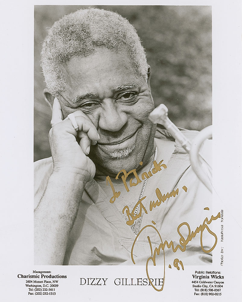 Glossy 8 x 10 promotional photo, signed and inscribed in gold ink, “To Patrick, Best wishes, Dizzy Gillespie ’91.” In very fine condition. RR Auction COA.