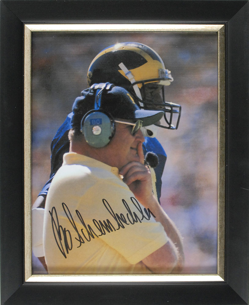 Color 8 x 10.75 magazine photo of Schembechler on the Michigan sideline, signed in black felt tip. Framed to an overall size of 10.75 x 13.25. In fine condition. Pre-certified Steve Grad/PSA/DNA and RR Auction COA.
