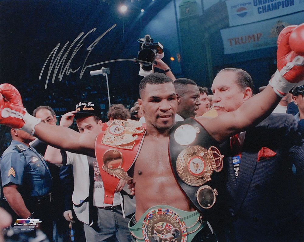Color glossy 20 x 16 photo of Tyson draped in his title belts after his fight with Michael Spinks, signed in silver ink. Rolled and in fine condition. Pre-certified Steve Grad/PSA/DNA and RR Auction COA.