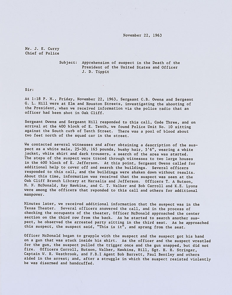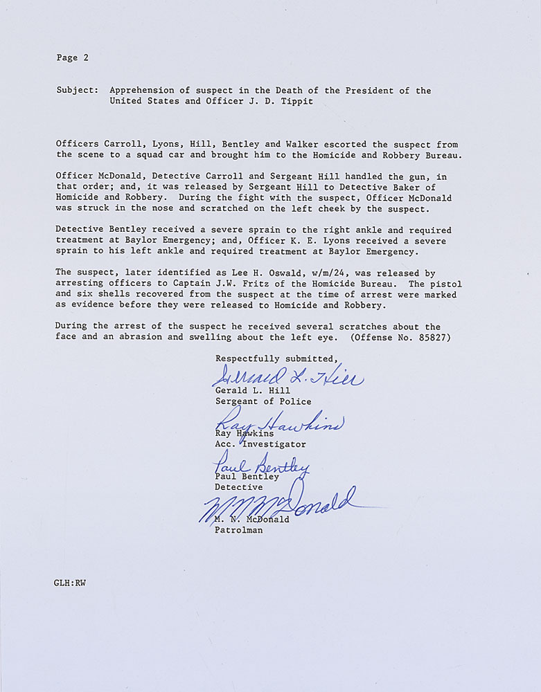 Souvenir typescript of the statement made by the arresting officers of Lee Harvey Oswald and submitted to Police Chief J. E. Curry, two pages, 8.5 x 11, signed at the conclusion in blue ballpoint by Gerald L. Hill, Ray Hawkins, Paul Bentley, and M. Nick McDonald. In part: “At 1:18 P.M. Friday, November 22, 1963…investigating the shooting of the President, when we received information via the police radio that an officer had been shot…There was a pool of blood about two feet north of the squad car in the street…Minutes later we received additional information that the subject was in the Texas Theater [sic]…Officer McDonald approached the center section on the third row from the back…As he approached the subject, the suspect said, ‘This is it,’ and sprang from his seat….after a struggle in which the suspect resisted violently he was disarmed and handcuffed…The suspect, later identified as Lee H. Oswald, w/m/24, was released by arresting officers to Captain J.W. Fritz of the Homicide Bureau.” In very fine condition. RR Auction COA.