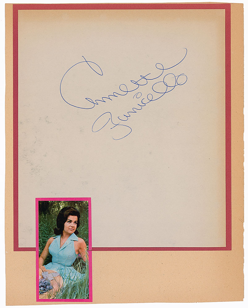 Large vintage ballpoint signature, “Annette Funicello,” on an off-white 7.25 x 8.25 sheet. Sheet is affixed to a slightly larger red sheet which is in turn affixed to an 8.25 x 10.5 scrapbook page with a clipped photo of Funicello affixed near the bottom. In fine condition, with a bit of mild toning. Pre-certified PSA/DNA and RR Auction COA.