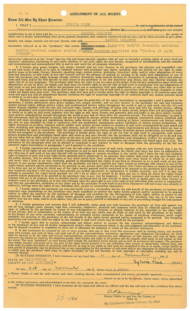Lyricist and composer (1913–1991) and wife of Danny Kaye. Notarized DS one page, 8.25 x 14, November 11, 1944. Agreement between Fine and Samuel Goldwyn in which Fine assigns all rights to a “certain literary and/or dramatic material and/or musical number and/or comedy routine entitled ‘So-O-O In Love Number.’” Signed at the bottom by Fine. In fine condition, with expected document wear. Pre-certified PSA/DNA and RR Auction COA.