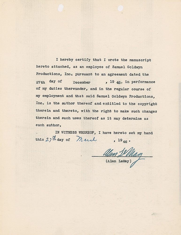 Novelist and screenwriter best remembered for The Searchers and The Unforgiven. DS one page, 8.5 x 11, March 27, 1946. LeMay acknowledges, “that I wrote the manuscript hereto attached, as an employee of Samuel Goldwyn Productions, Inc.” In fine condition, with a horizontal fold passing through signature and expected document wear. Pre-certified PSA/DNA and RR Auction COA.