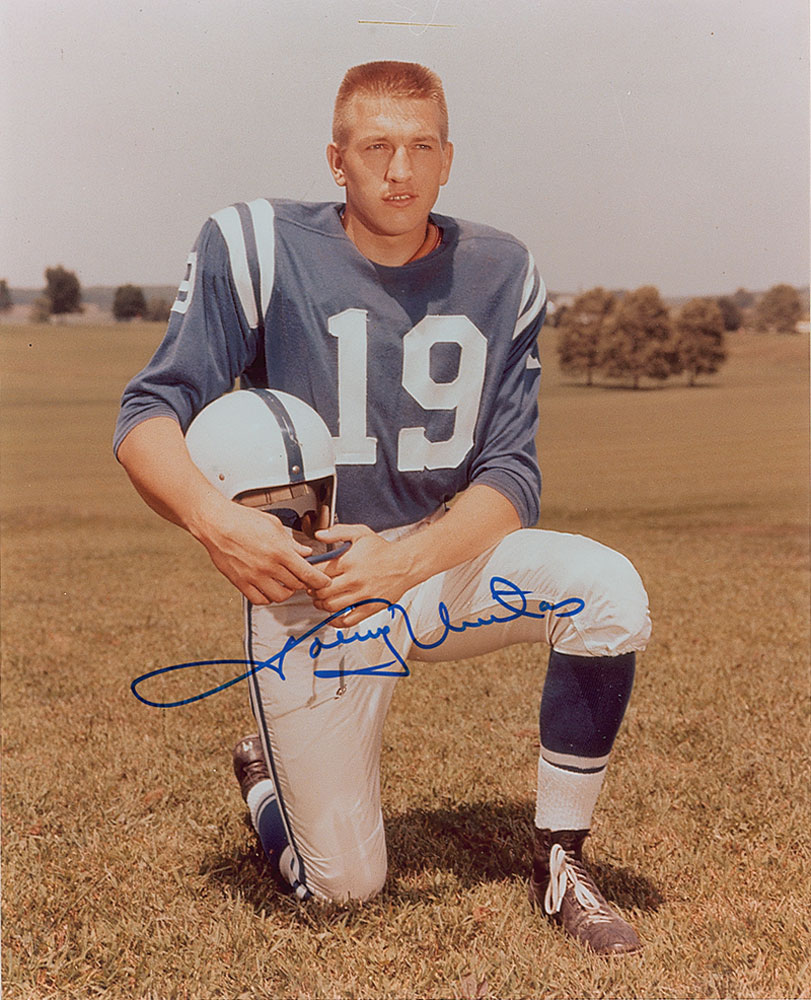 Color glossy 8 x 10 photo of a young Unitas in his Colts uniform, signed in blue felt tip. In fine condition. Pre-certified Steve Grad/PSA/DNA and RR Auction COA.