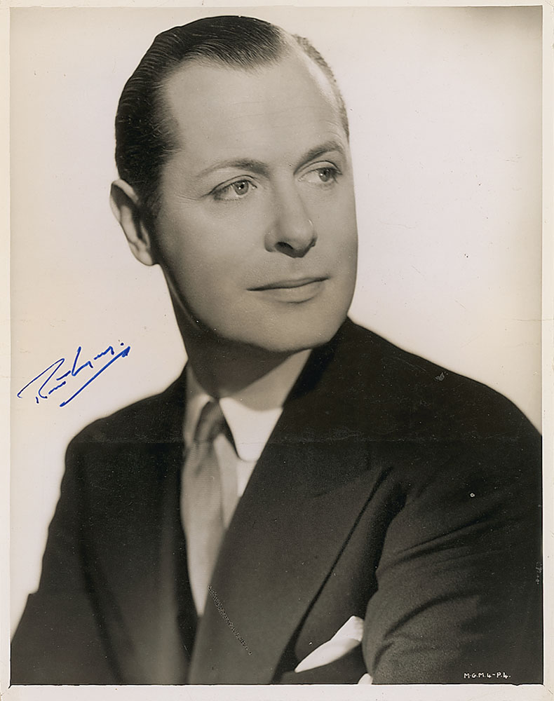 Handsome glossy 8 x 10 MGM publicity photo of Montgomery, signed in blue felt tip. A few surface creases, surface abrasion to the bottom of his lapel, and some rippling to the center from original affixed caption to reverse, otherwise fine condition. Pre-certified PSA/DNA and RR Auction COA.