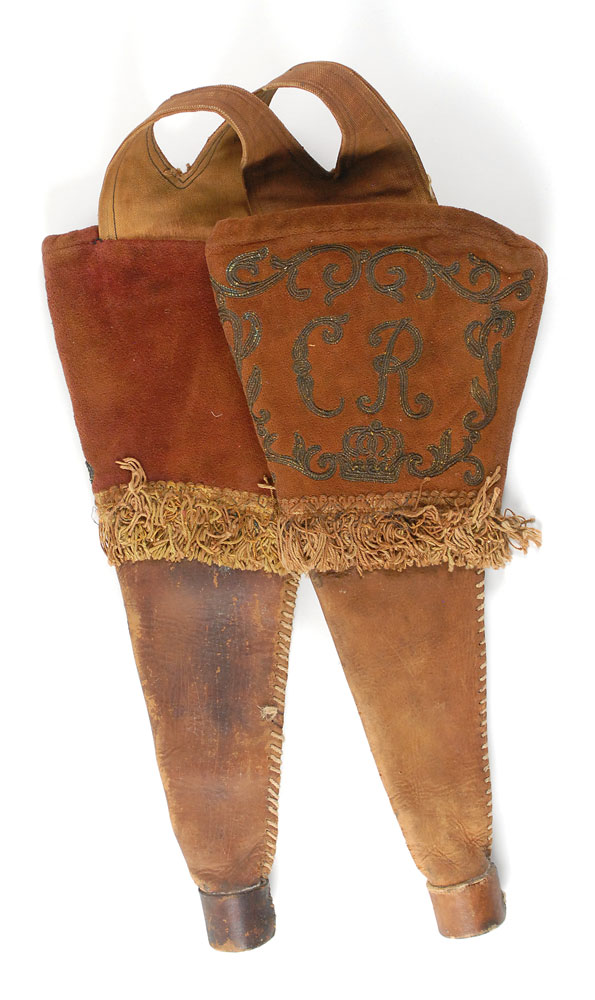 A set of screen-used leather holsters from the 1947 film Forever Amber. Ornate leather and cloth holsters measure 17″ long, with the cloth embroidered “CR,” (for the King’s army), with both having a leather-wrapped wooden endcap. Holsters are connected together by a canvas strap, with a Fox inventory number written on the strap in black ink. In fine condition. RR Auction COA.