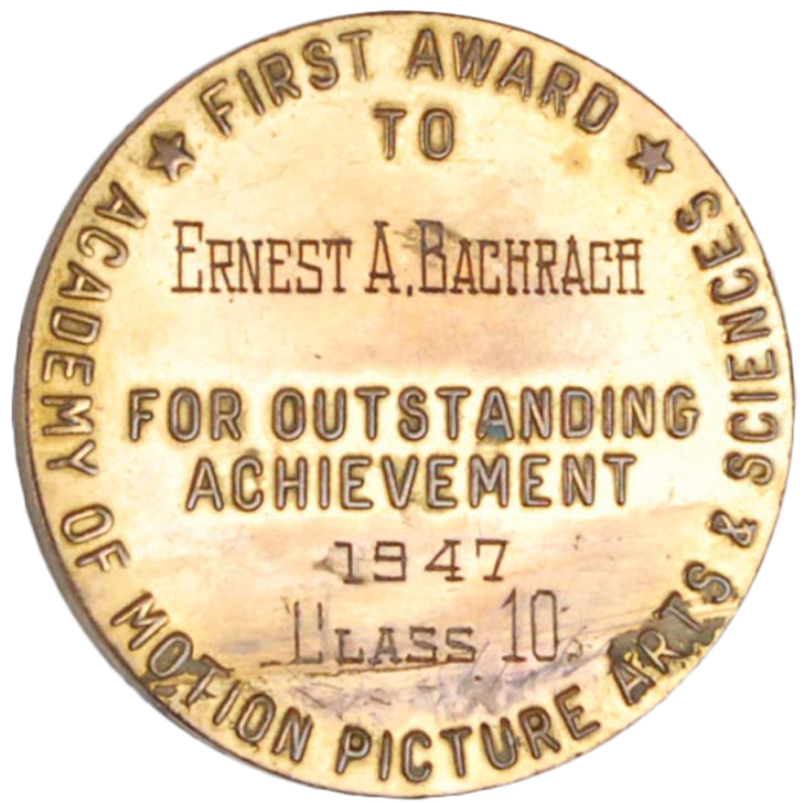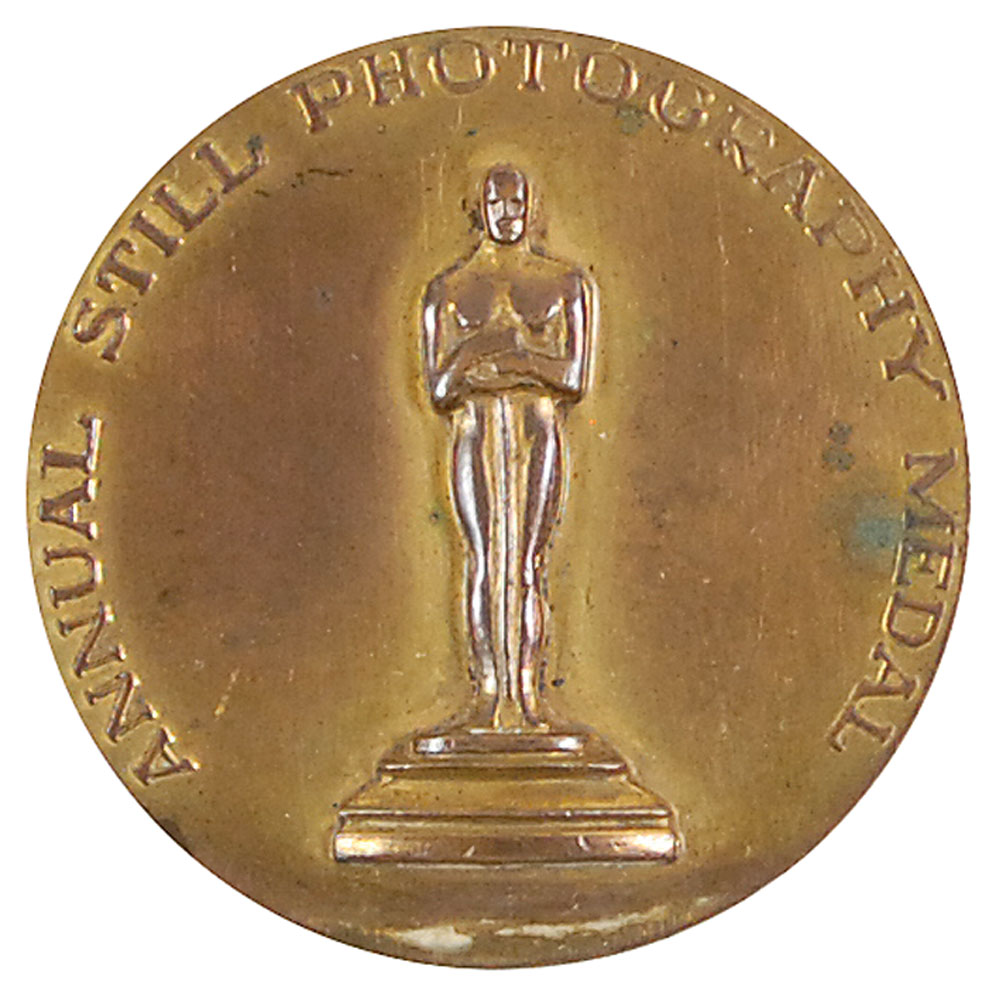 Revered photographer (1899–1973) of Hollywood’s ‘Golden Age’ who was the still photographer for King Kong and Citizen Kane as well as most of RKO's classic output. He was especially well-known for his portrait studies of great actors and actress, including a series of color shots of Marilyn Monroe; also admired for his versatility, Bachrach's production work on King Kong is noted for the various effect shots and composites he produced both for continuity and the promotional campaign. Extremely rare Academy Award medal, measuring 1.75″ in diameter, given to Bachrach in 1947 for his work on Crossfire and The Farmer’s Daughter. Front features the words “Annual Still Photography Medal” and an Academy Award statuette in relief, with text to the reverse reading, “Academy of Motion Picture Arts & Sciences, First Award to Ernest A. Bachrach For Outstanding Achievement, 1947, Class 10.” In fine condition with some scattered tarnishing (most noticeable near the word ‘medal’ on the front).