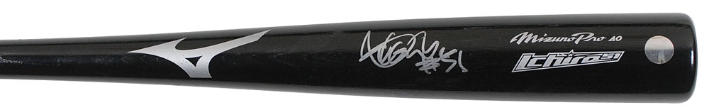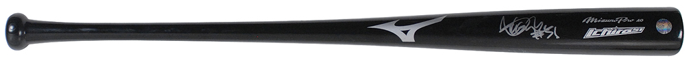 Official Mizuno Pro AO Ichiro Suzuki professional model baseball bat, circa 2011, signed in silver ink on the barrel. Knob is factory stamped with his number, “51,” and the text, “AB50,” indicating it was the 50th bat that Ichiro ordered during the season. The barrel displays evidence of light to moderate use, with ball marks, stitch impressions, and blue ink transfers. In fine condition, with Ichirco’s personal authentication label affixed to the barrel. Accompanied by a full letter of grading and authenticity, designating it a ‘GU 8,’ describing it as possessing identifiable player use characteristics and specifications. Ichiro led the league in at-bats in 2011, which was his last full season in Seattle. Pre-certified Steve Grad/PSA/DNA and RR Auction COA.