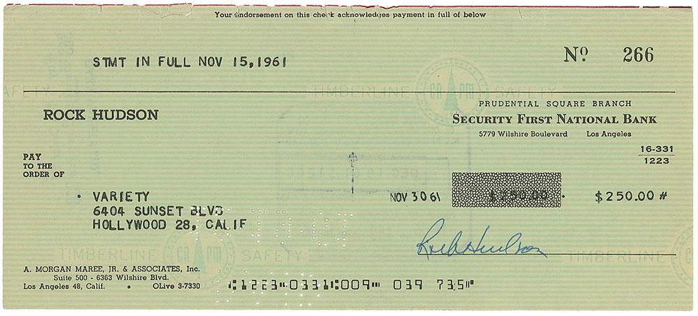 Personal check, 8.25 x 3.75, filled out in type and signed by Hudson, payable to Variety for $250.00, November 30, 1961. In fine condition, with expected stamps and holes, none affecting the clean signature area. Pre-certified PSA/DNA and RR Auction COA.